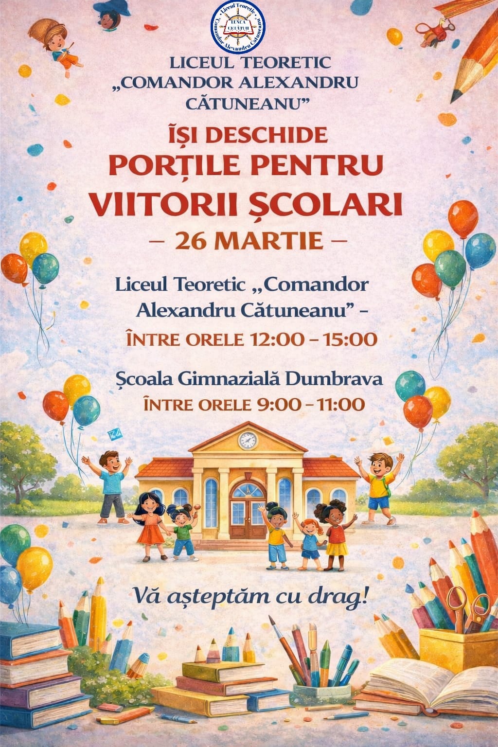 Dragi părinți, vă invităm să vă înscrieți copiii în clasa pregătitoare la Liceul Teoretic „Comandor Alexandru Cătuneanu” și structurile arondate! 🏫✨